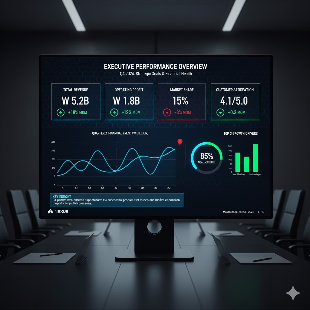 - 원 페이지 요약: 매출, 영업이익, 현금 흐름, 시장 점유율, 고객 만족도 등 4~6가지의 가장 중요한 KPI(핵심 성과 지표)를 카드 형태로 크게 배치합니다. 각 카드에는 현재 값, 목표 대비 달성률, 전월/전년 대비 증감률을 함께 표시하여 신속한 현황 파악을 돕습니다.